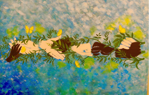 毛里求斯艺术家卢乔蒙·克里希纳·库马尔的三联画《共同的根》以根系相连的树木为主体,巧妙勾勒出多元与统一的深刻寓意。王建国、许奕轩、李垣垣的油画《大地粮仓》以高饱和色彩的碰撞构建视觉张力,既展现收割草垛场景的真实触感,又赋予土地以生命体征,呈现出一种质朴而深沉的美感,以及对东北大地和自然力量的敬意。