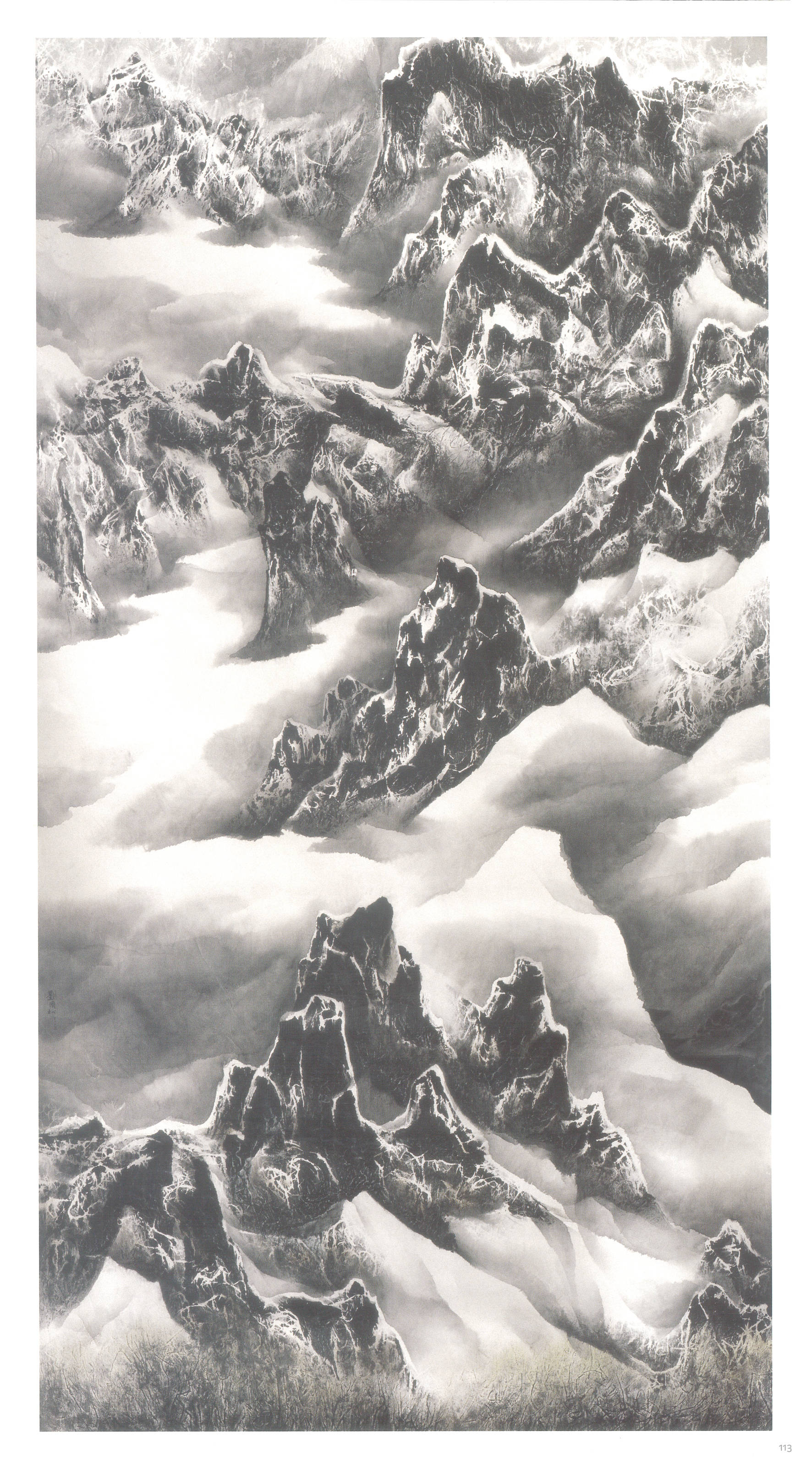 刘国松的《云与山的游戏》展现藏地高原上云雾与雪山的灵动对话。王绍强的《中国春江花月》中,群山、春江和月光等画中元素被精心布局,形成了一种流动且和谐的视觉效果,色彩的明暗对比和渐变、笔线的虚实变化以及渲染的微妙差异,营造出若隐若现的立体感和静穆的意境。